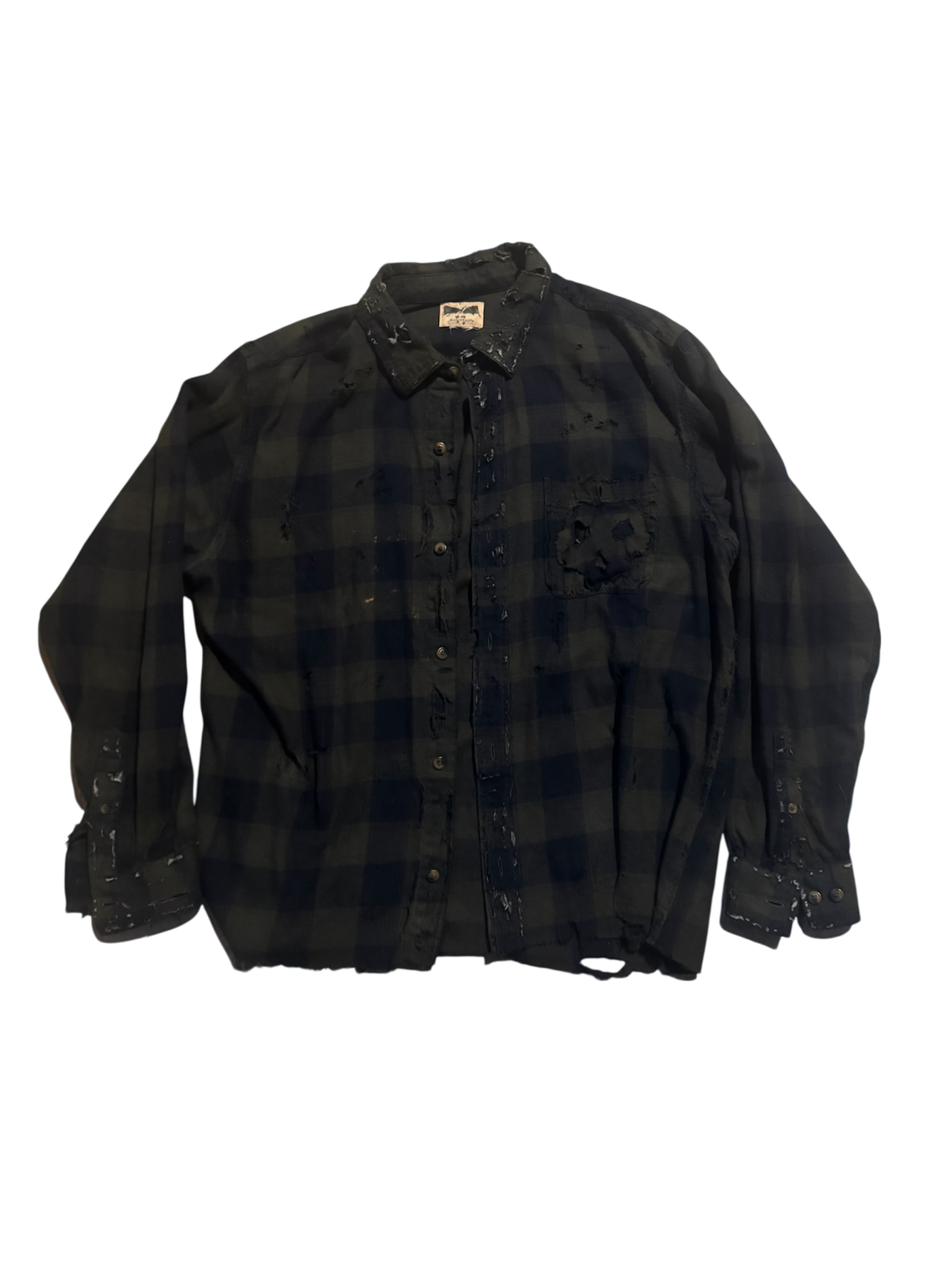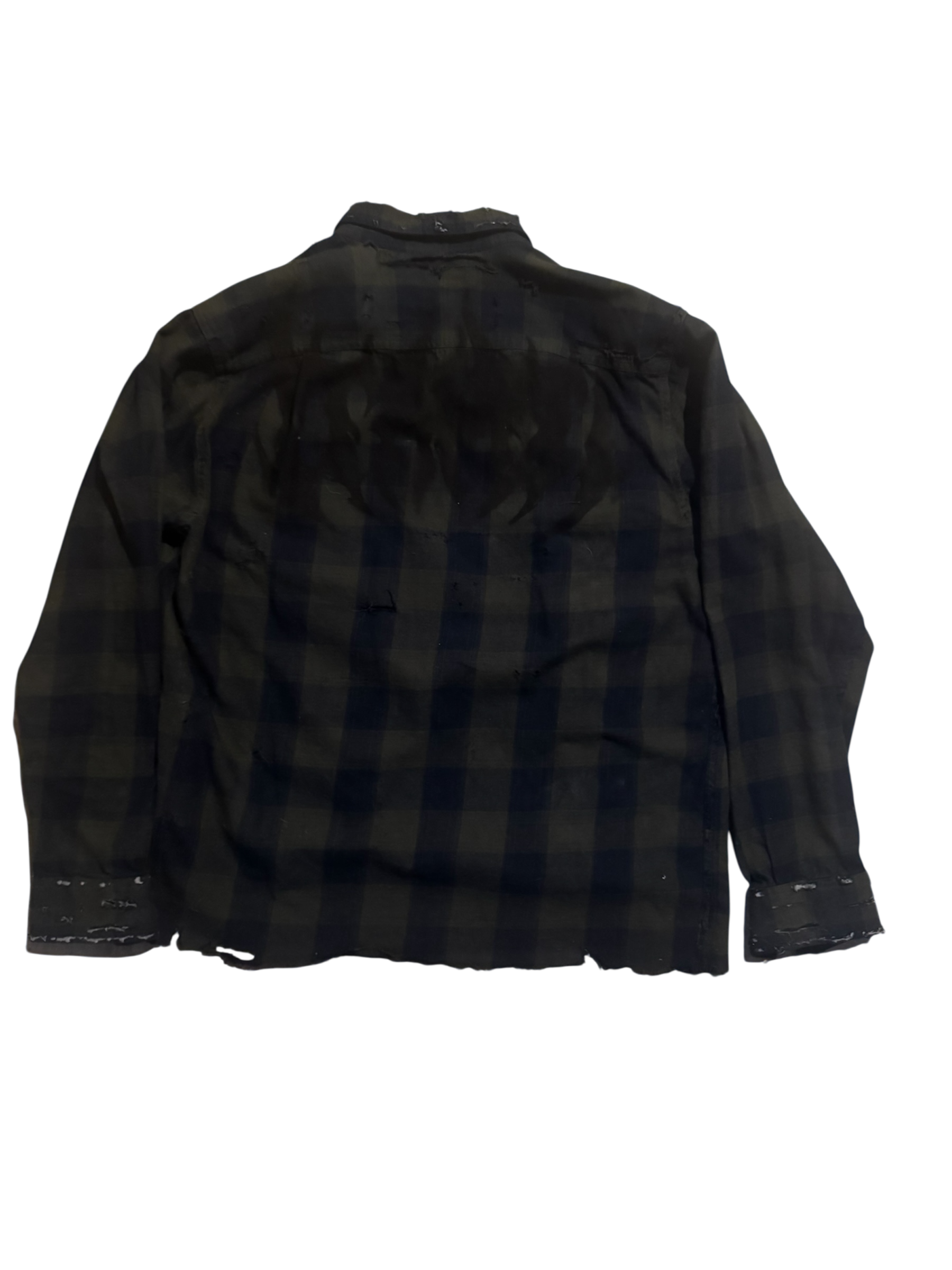 100% cotton flannel fully distressed with back plaster and signature skull.