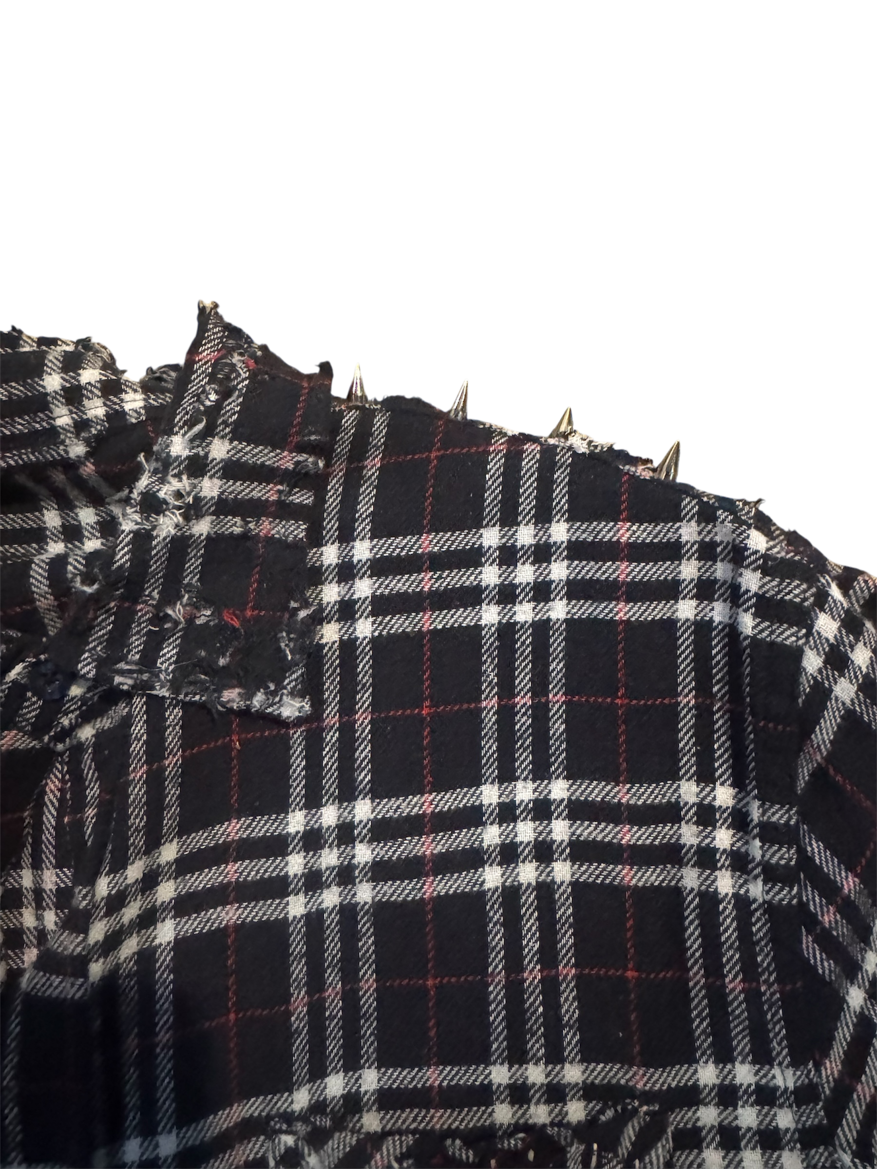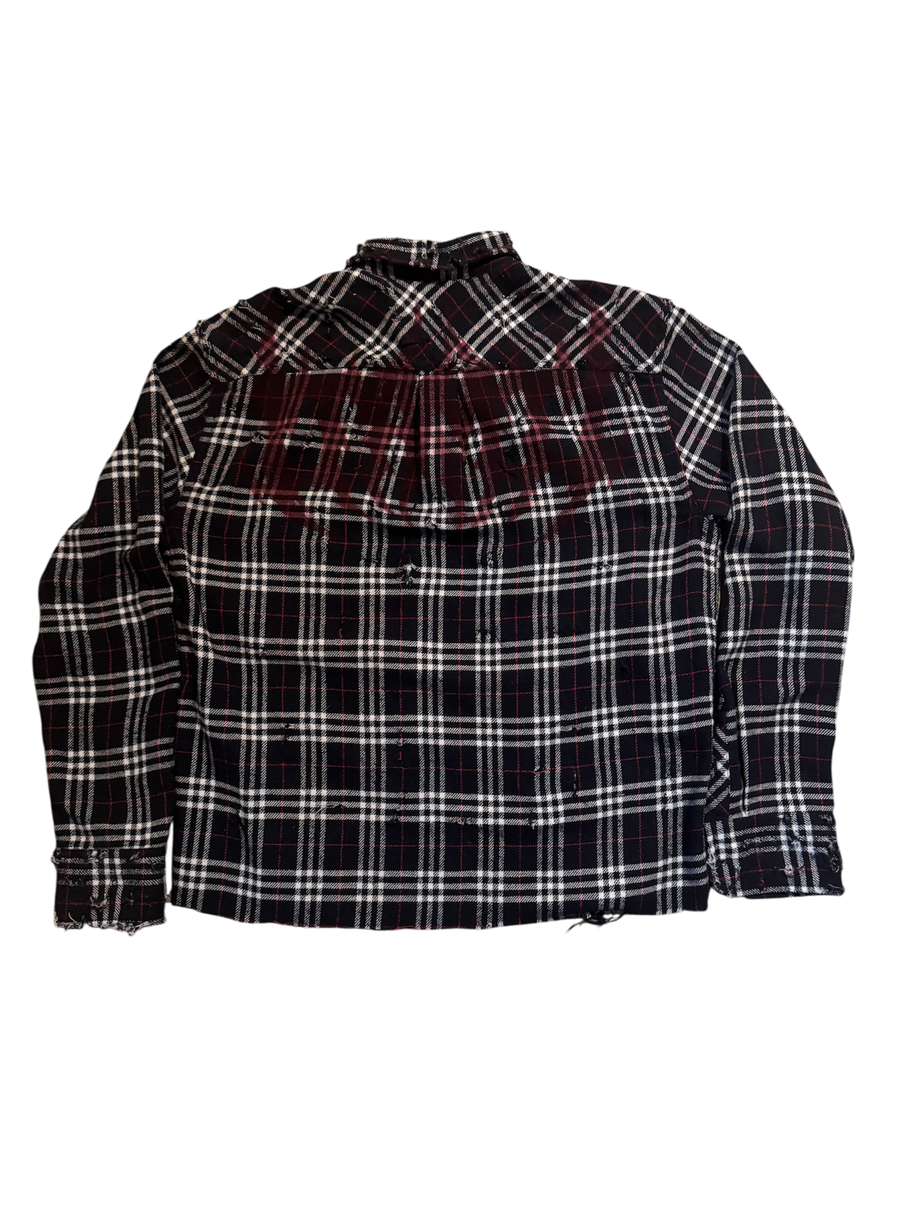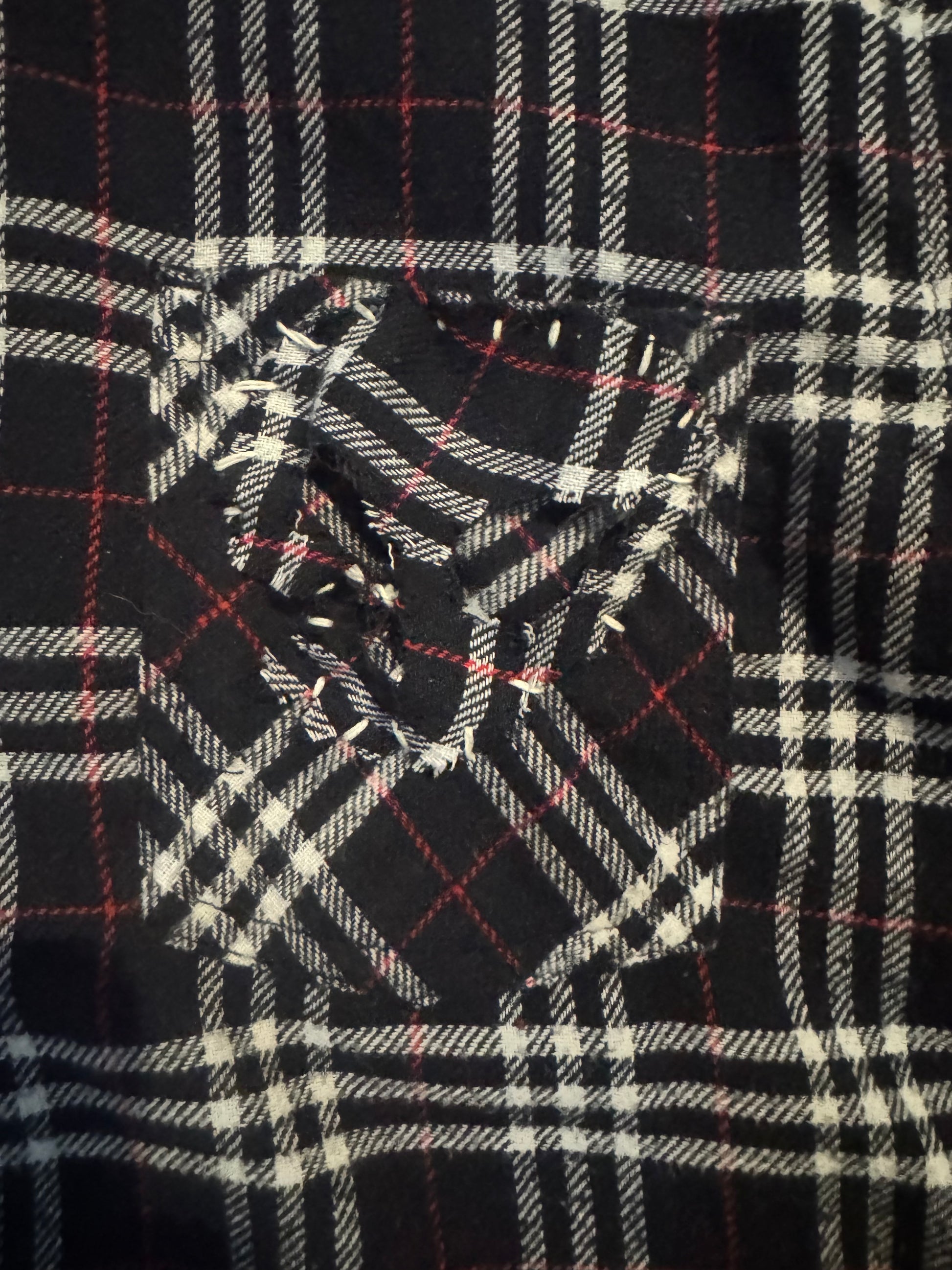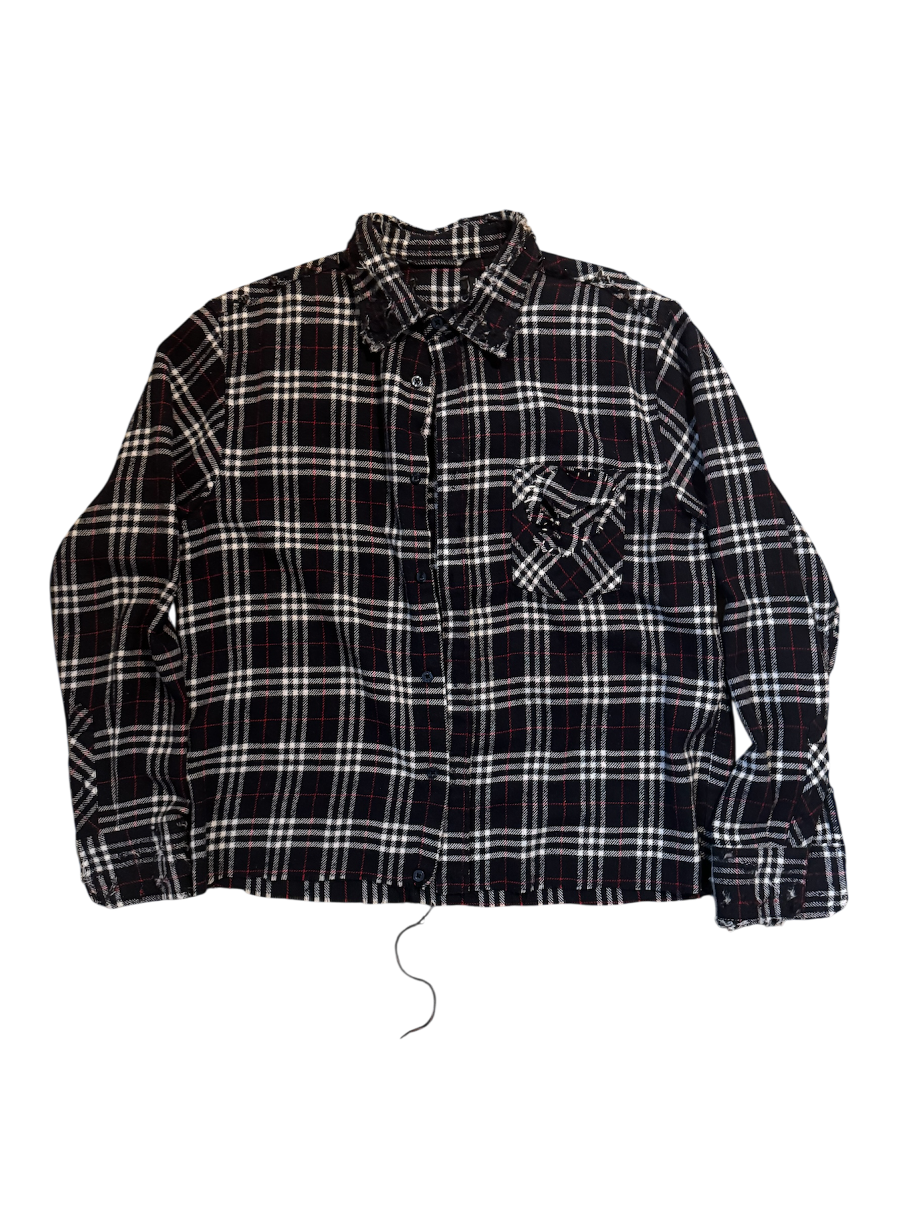 100% cotton flannel with studs down to the shoulders, back plaster with light distressing, with signature skull.